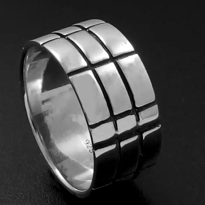 Flat Silver Band Ring Checker Pattern has a lined checkers pattern etched onto the smooth wide plain band. This is a strong wide band at an awesome price for so much silver content. Great for guys. You wont be able to break this baby! This could be a sneaky cheaper option for a wedding band. It is nice to have the stylised pattern instead of a plain silver. There is a good weight of silver in this ring making it durable and strong. The pattern follows around the ring at 7 mm increments except for where there is a join-but as seen in the image, the join adds to the look.