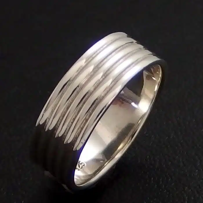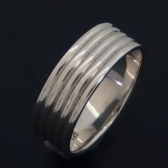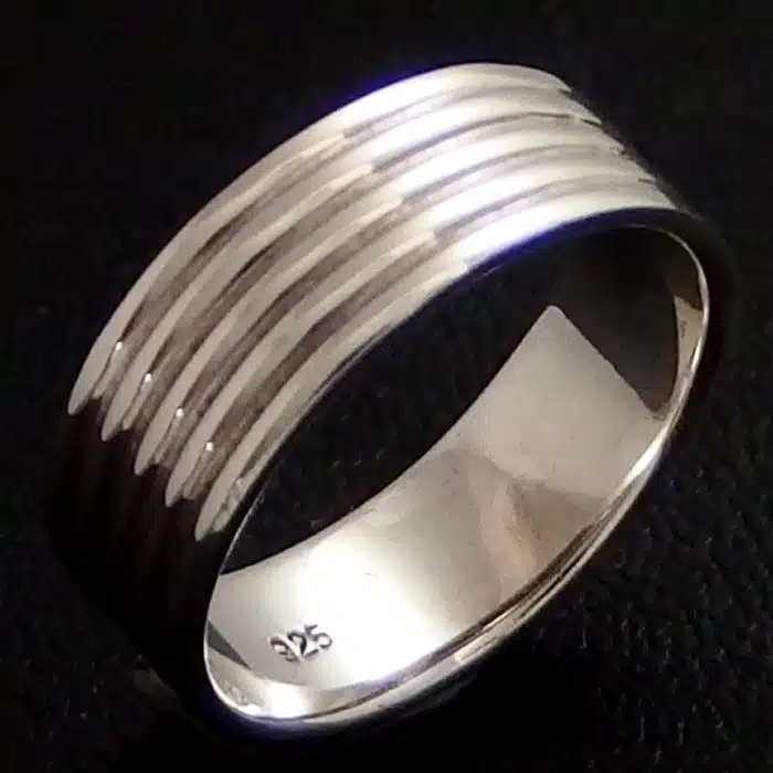 Silver Mens Band Ring Lined is sterling silver 92.5. It features 4 lined ridges adding style and simplicity to this ring. Guys usually like a fairly plain ring and this baby ticks the box by still being relatively plain, but more interesting with its lines. If four is your number even better..four kids? four is your lucky number? you are born on the fourth? four wives? ha ha, just joking lol. This is a popular simple men’s ring.