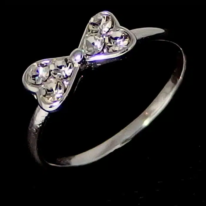 Child Bow Ring is a small dainty ring suitable for a child or person with small fingers. It features a CZ covered sterling silver bow on a sterling silver band. It is such a cute silver bow ring and a great price too.