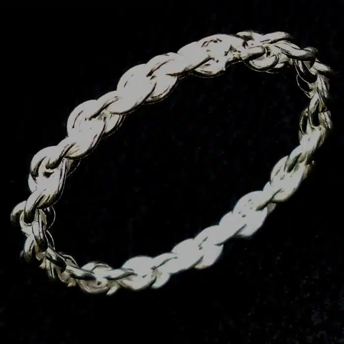 This “solid chain ring stackable” is made from sterling silver and features a 92.5 stamp. This means it is 92.5% fine silver with no more than 7.5% of copper or other metals. This formula is internationally accepted and it gives sterling silver the hardness and the tolerance to work with. Anything higher than 92.5 would be too soft and tarnish too quickly. When you buy sterling silver from us, we can guarantee it is just that!