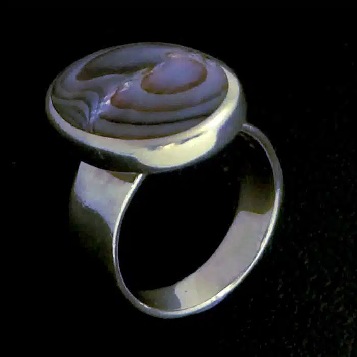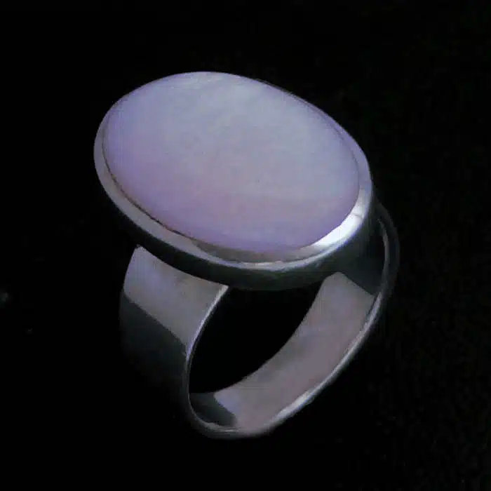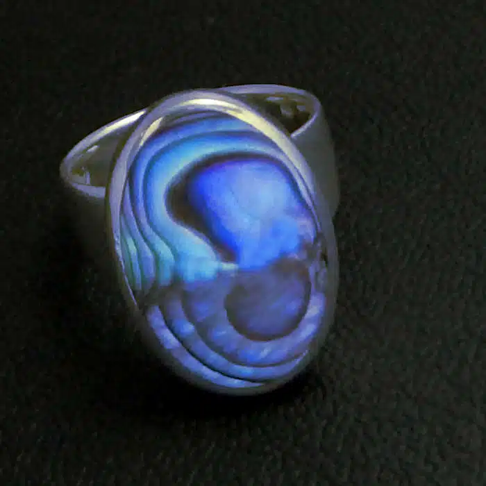 Oval shell ring is set in sterling silver 92.5. Shell is real mother of pearl (dyed or left natural) or Paua. Shell 15mm long x 22mm widest point.