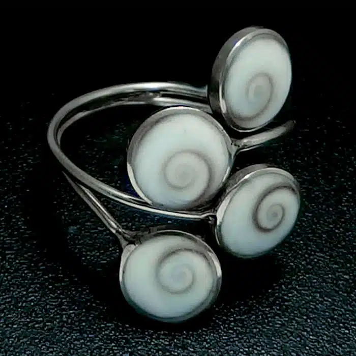 Spirals Shells Shiva Ring is sterling silver 92.5. This ring is a perfect gift as the size is can be adjusted, as it is not joint on the top. It features four shells on the top of the ring, which meet in teh centre. The shells are ever so striking and in their natural state.