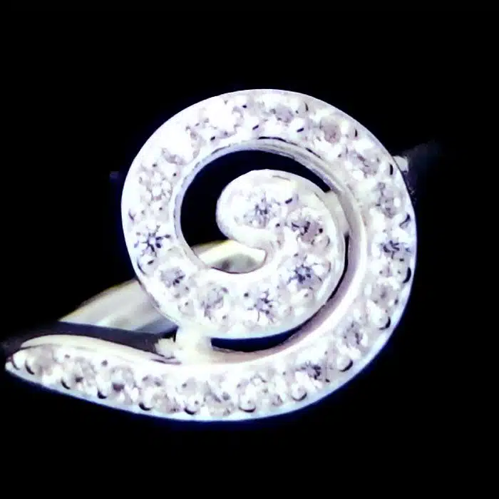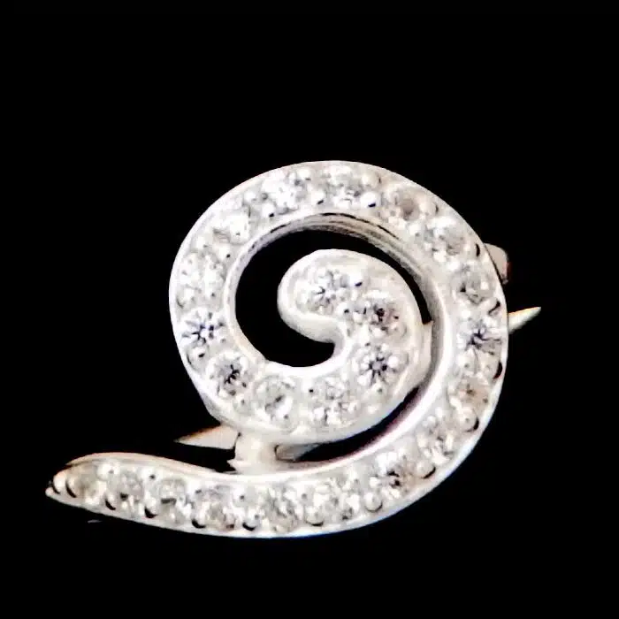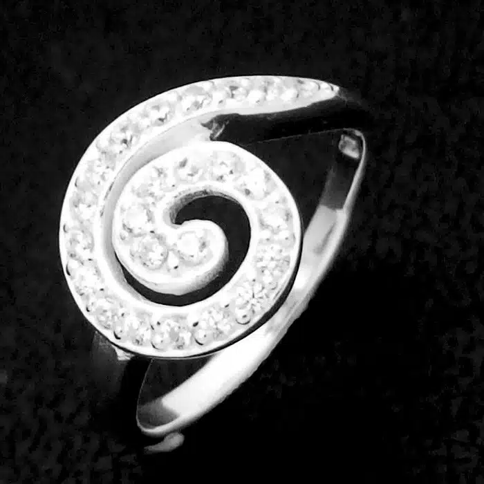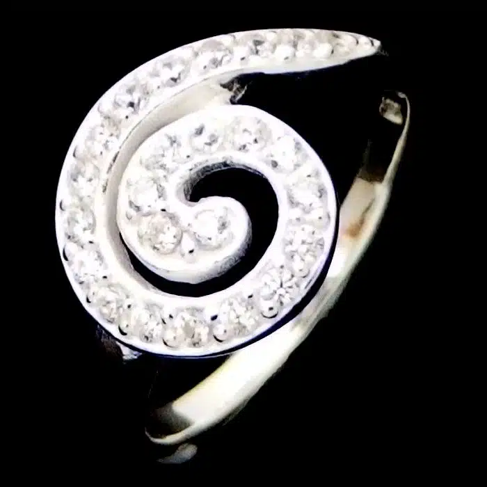This is a Beautiful Spiral CZ Ring with many tiny cubic zirconia stones set into the spiral. Spirals are iconic of New Zealand and especially popular with Maori. The Spiral represents new beginnings and new life.
