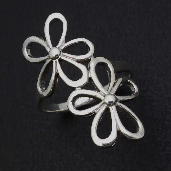 Flower ring sterling silver is just that-real silver of international standard which is 92.5. Double Flower Ring Sterling Silver has open cut out flower designs. It features two flowers joined together in partnership. Perfect for a flower lover or garden lover or someone who enjoys nature. This is a long ring and covers much of the finger first joint. Flower Ring Sterling Silver looks glamorous and gorgeous on the finger and is a great price for the size.