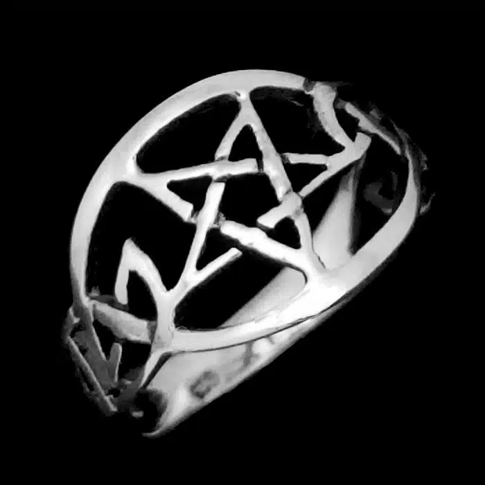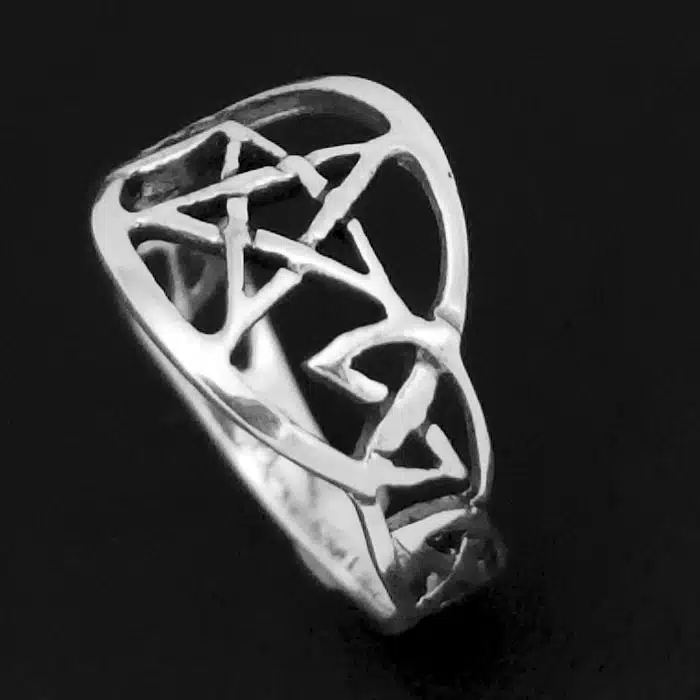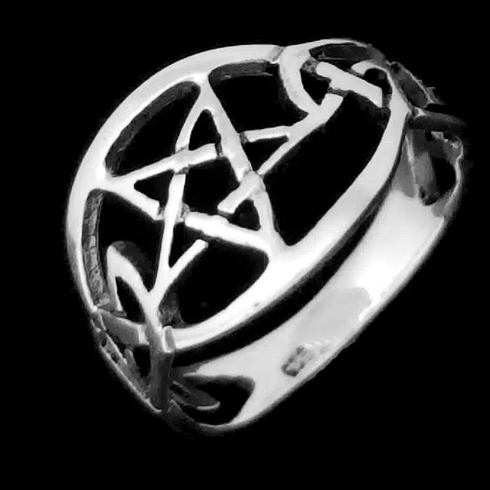 Pentacle Silver Celtic ring is sterling silver 92.5. This ring features a black magic pentacle star held inside a twisting Celtic pattern band. This is a well made ring with lots of cut out detailing. The pentacle symbol is well known symbol in Wicca and the pentagram or pentacle is a symbol of a star encased within a circle. The five points of the star represent different elements. The upward point of the star is representative of the spirit. The other four points all represent an element, earth, air, fire, and water. All these things contribute to life and are a part of each of us.