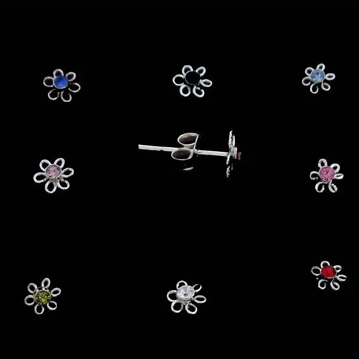 These small cut out jewelled flower stud are made from sterling silver. The butterfly also features the 92.5 stamp. This means it is 92.5% fine silver with no more than 7.5% of copper or other metals. This formula is internationally accepted and it gives sterling silver the hardness and the tolerance to work with. Anything higher than 92.5 would be too soft and tarnish too quickly. When you buy sterling silver from us, we can guarantee it is just that!