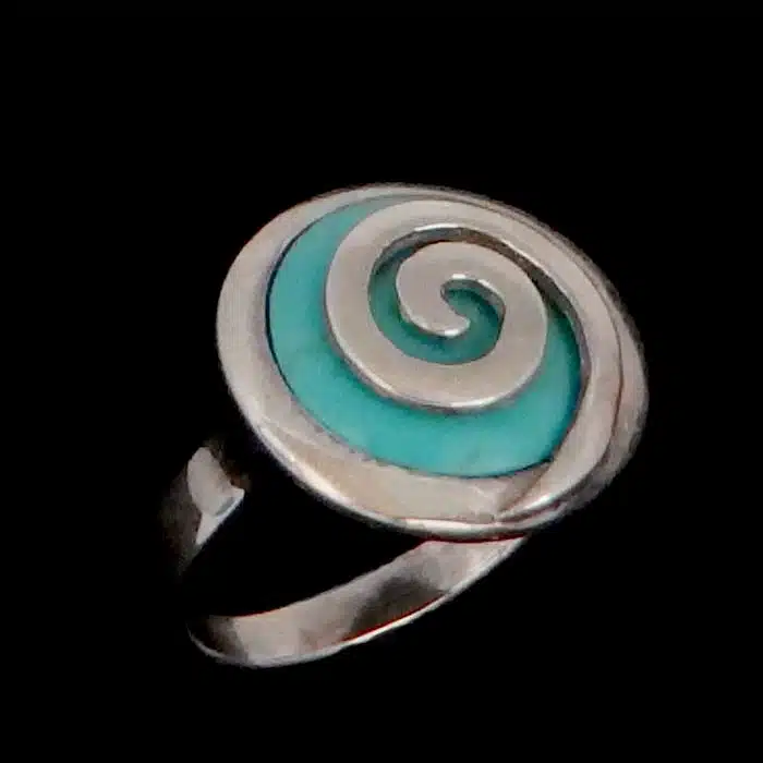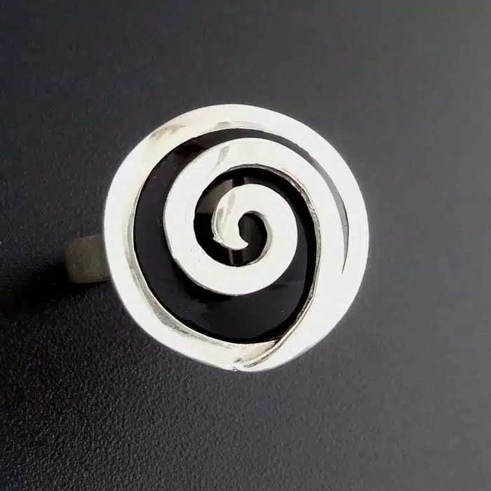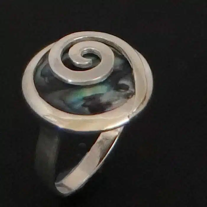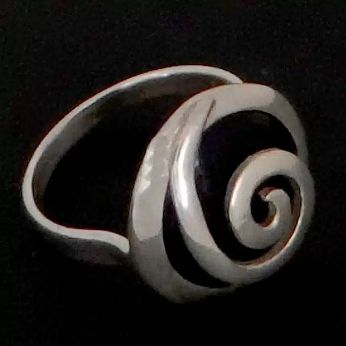 This spiral covered shell ring is made from sterling silver and features a 92.5 stamp. This means it is 92.5% fine silver with no more than 7.5% of copper or other metals. This formula is internationally accepted and it gives sterling silver the hardness and the tolerance to work with. Anything higher than 92.5 would be too soft and tarnish too quickly. When you buy sterling silver from us, we can guarantee it is just that!
