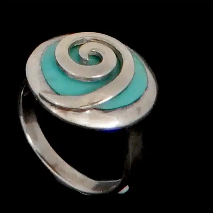 Spiral covered shell ring set in sterling silver 92.5. A circle shell with a sterling silver spiral casing. Shell is natural mother of pearl, synthetic onyx or synthetic turquoise. The silver spiral sits on top of the shell as a separate layer.