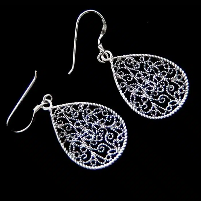 Tear Filigree Earrings Silver NZ are made from sterling silver and features a 92.5 stamp. This means it is 92.5% fine silver with no more than 7.5% of copper or other metals. This formula is internationally accepted and it gives sterling silver the hardness and the tolerance to work with. Anything higher than 92.5 would be too soft and tarnish too quickly. When you buy sterling silver from us, we can guarantee it is just that!