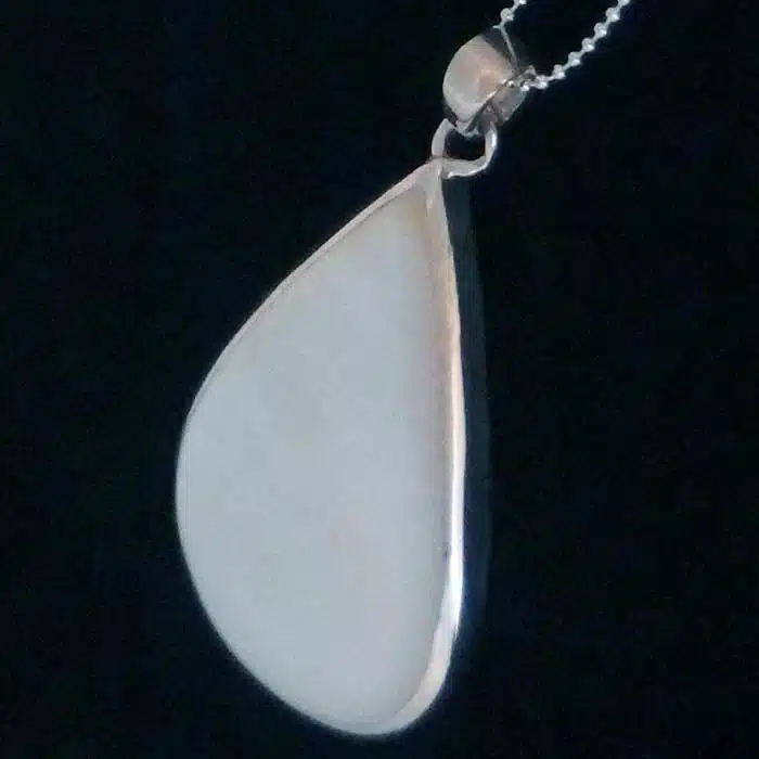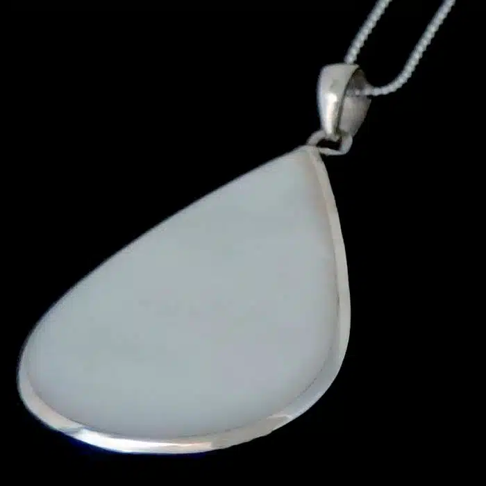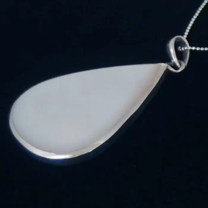 The Teardrop Mother Pearl Necklace is made from sterling silver and features a 92.5 stamp, this means it is 92.5% fine silver with no more than 7.5% of copper or other metals. This formula is internationally accepted and it gives sterling silver the hardness and the tolerance to work with. Anything higher than 92.5 would be too soft and tarnish too quickly. When you buy sterling silver from us we can guarantee it is just that!