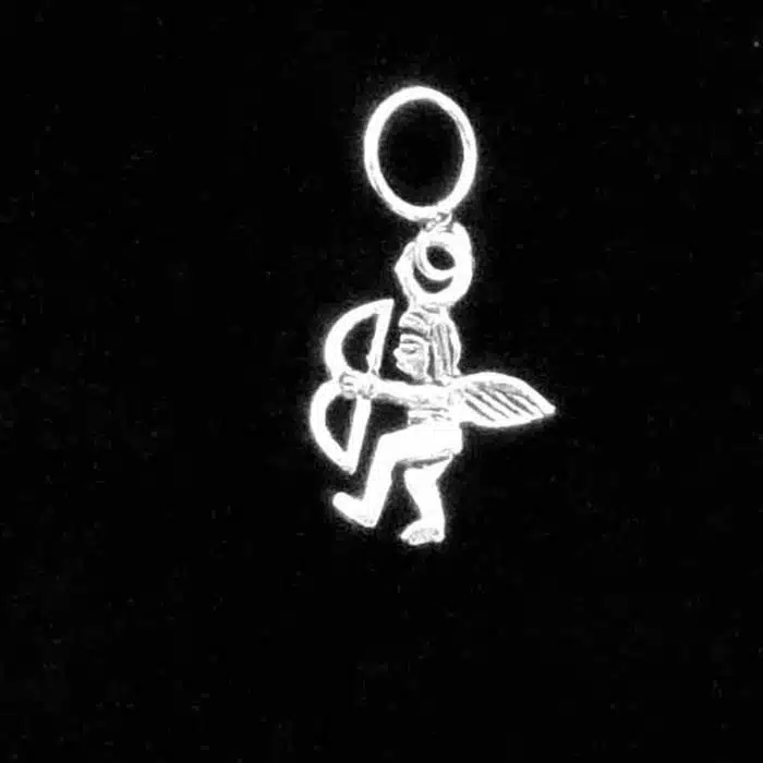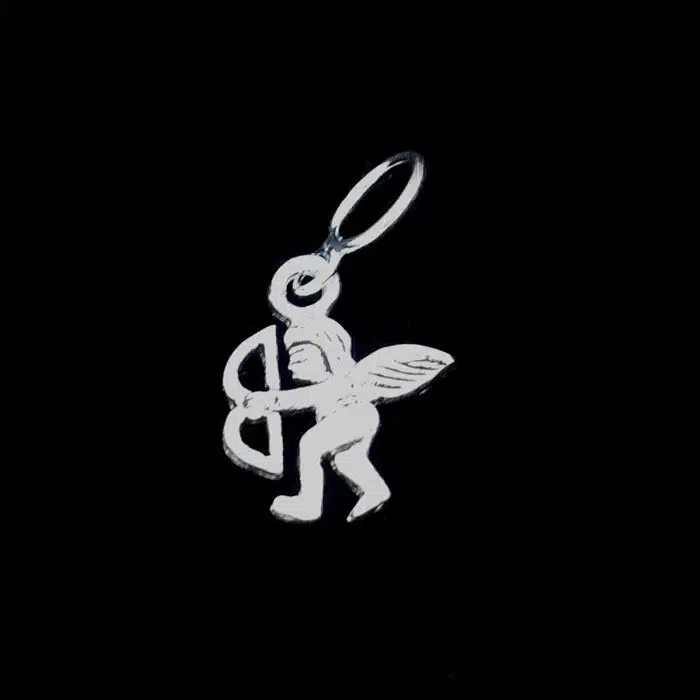 The wee cupid charm pendant is made from sterling silver and features a 92.5 stamp. This means it is 92.5% fine silver with no more than 7.5% of copper or other metals. This formula is internationally accepted and it gives sterling silver the hardness and the tolerance to work with. Anything higher than 92.5 would be too soft and tarnish too quickly. When you buy sterling silver from us, we can guarantee it is just that!