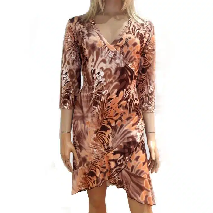 It is a great trans seasonal number and when you think about it, we spend a great percentage of our year in between seasons. This printed flounce dress has cross over styling on the breast making for an attractive accent on your womanly curves!! This garment is one-size-fits-most, as it is very stretchy and flattering. There are two colour ways; Tan Spiral and Plum Spiral. This dress is complimentary to many shapes and sizes. The printed flounce dress is a very versatile and timeless addition to any wardrobe. You made need one in every colour!