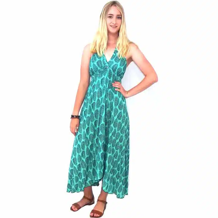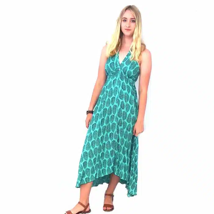 Halter Long Dress-Green is simply gorgeous. One size fits most 8-14. This green halter dress can be made to fit so many sizes because you can slip into it like a skirt, then tie the neck halter straps. Secondly you tie the straps that wrap around the body. As the ties wrap around the body, they cross under the breasts and this gives the bust a gorgeous line. You will love that this green halter dress can be tied to your exact size. It is perfect if you have fluctuating weight changes. There is nothing worse than a dress you can no longer wear because you have gained or lost too many kilos.