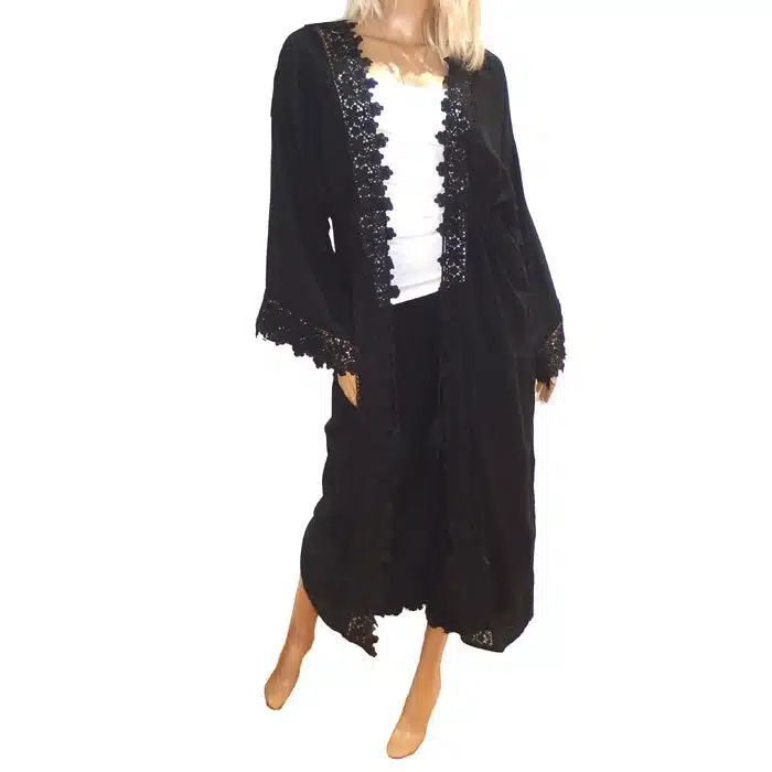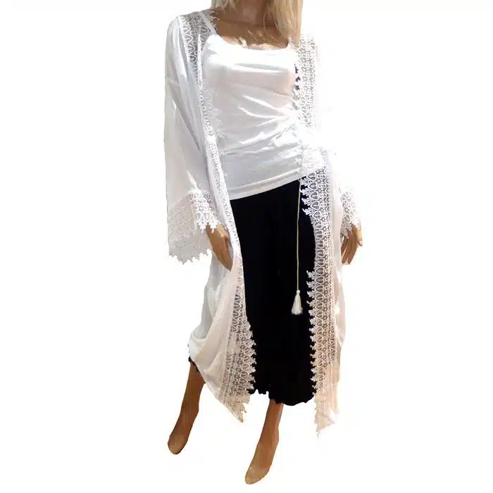 Summer Lace Over kimono is a open front style long lace kimono. The flared lace sleeve and beautiful Boho style create a slimming effect. The wide, open fit ensures it will fit most sizes. This long kimono also features gorgeous lace down the whole front, and a sweet tassel tie-up at the waist. This Summer Lace Over Kimono can be worn over a dress or shorts in the warmer weather, and with tights or jeans in the winter. Just throw on a merino or long-sleeve underneath to keep your arms warm. This Summer Lace Over Kimono comes in 2 colours, black or white. Just pick your favourite, or grab both! It is a gorgeous addition to any wardrobe. It looks fabulous on the beach with jandals or out at the night club with heels and bare legs.
