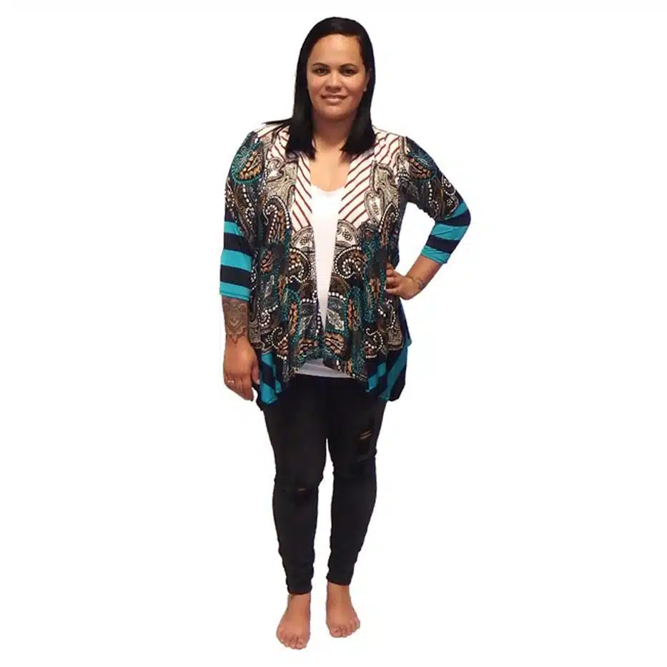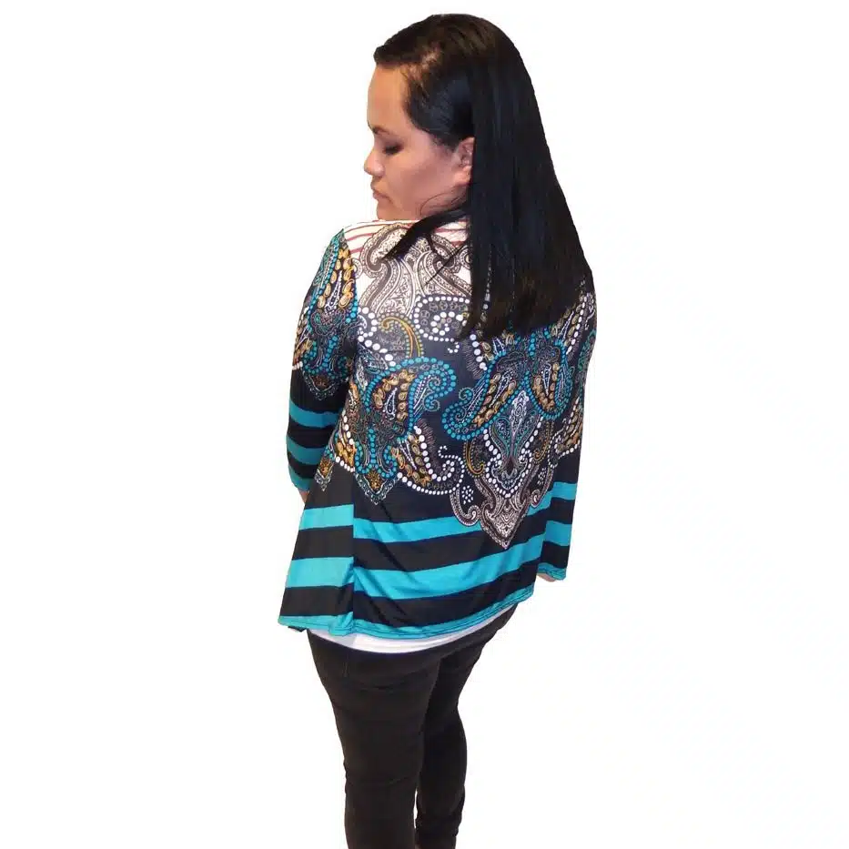 Pattern Slink Jacket is a gorgeous garment. This is a great no ironing jacket as it seems to remain relatively crinkle free. It is ideal for traveling. The fun, colourful patterns and casual cut hem-line create a slimming effect, and the tie open front style ensures this item will fit most bust and stomach sizes. This jacket can be thrown over a dress, evening wear, or keep sun off on a hot day. The perfect throw-over for in-between and hot summer weather. This garment is a timeless addition to any wardrobe and is an item that you will wear again, and again, in the warmer weather, or with tights or jeans in the winter. The pattern slink jacket comes in two colour ways, a Maori combination black, red and white colourway, and a blue brown ethnic pattern. Both a perfect addition to any wardrobe. This fabric is also stretchy which helps it to fit many sizes.