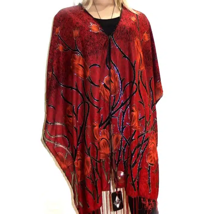Viscose is often referred to as “faux silk” and goes by the everyday name of rayon. If your poncho needs washing, gently hand wash in cool water. Or I prefer the ease of choosing the delicate or gentle cycle on my washing machine. Also choose the cold wash and wash this item separately.