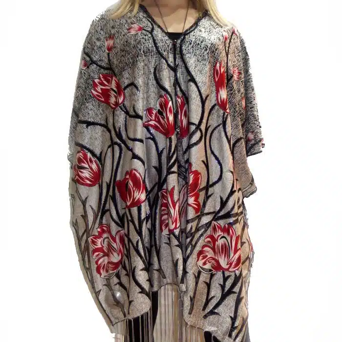 Tulip Burnout Poncho NZ is a simple, comfy, statement piece, to add to to any wardrobe. Made from a transparent, viscose (mesh), fabric, these ponchos are breathable, light, and easy to wear. In the warmer weather, you can wear these light ponchos with shorts or a dress and some sandals. In winter, our customers love it with a pair of jeans and a long-sleeved merino underneath. This makes for a warmer poncho, and a great layered look. Because of the lightweight, mesh, breathable fabric, these Tulip Burnout Poncho NZ are also awesome in summer as a Kaftan cover-up over your bikini or togs at the beach or around the pool. There are endless ways to wear and style these ponchos. Perfect as an evening poncho too. The sparkle within the fabric of the Tulip Burnout Poncho NZ makes it glitter in the evening light.