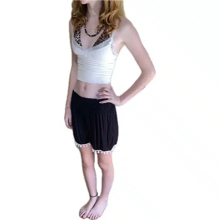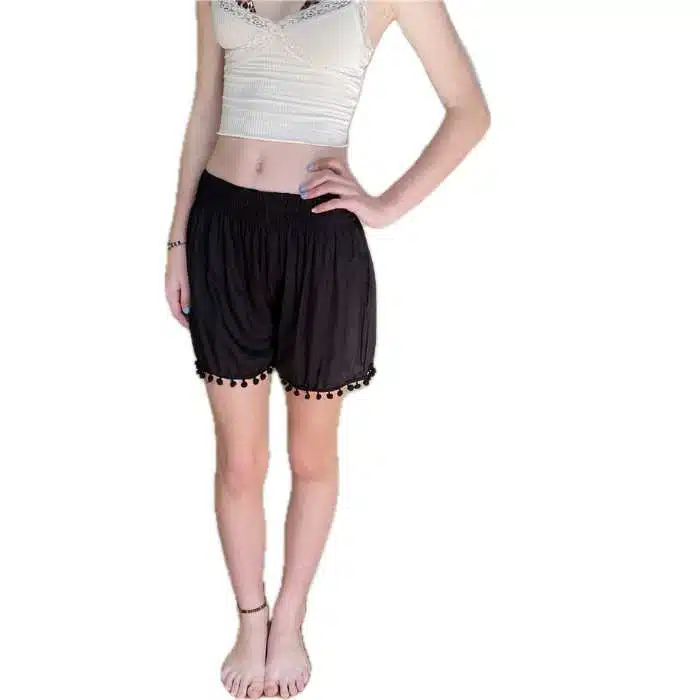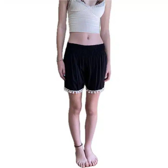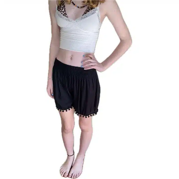 The bottom of these shorts have a line of pretty pom poms sewn in for a different, bohemian style. These shorts are a one-size fits most sizing because there is a stretchy elastic waist. So they should fit a true size 8-14. The leg length sits on the high thigh on most people. The waist sits just below the belly button. This makes them perfect for showing off a belly button piercing. Match back with a crop top and it is even cuter. It looks great with a cheap plain singlet top or action back top.