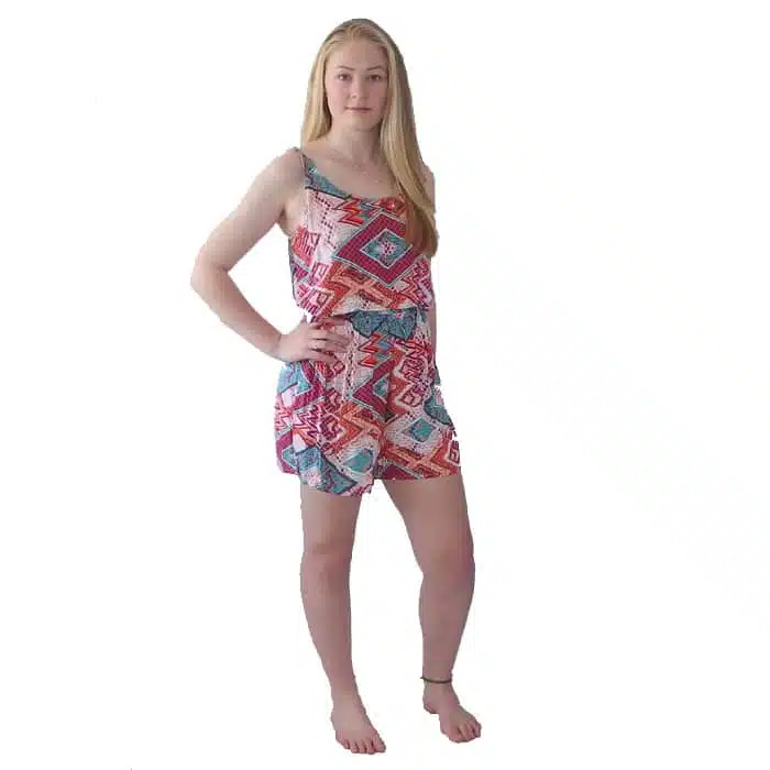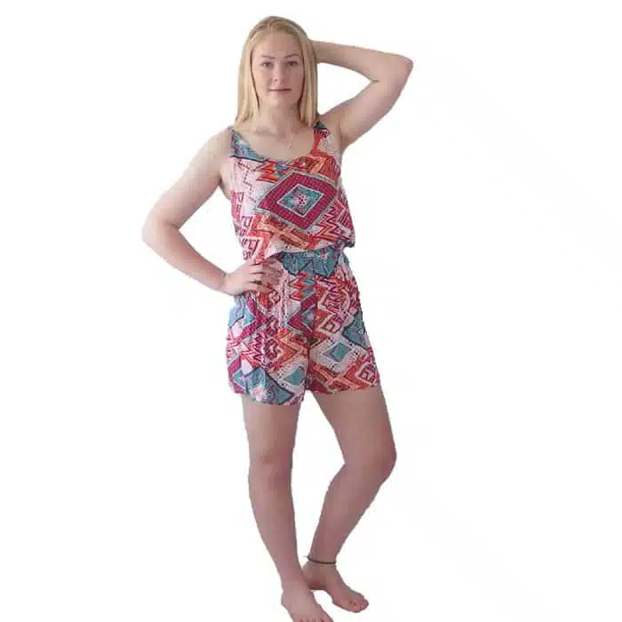 Summer Jump Suit NZ is gorgeous and bright. Perfect for summer. This sweet jump suit has spaghetti straps that are adjustable and elastic at the back and waist. It is a one size fits most. By this we mean, a true 8-14 size. It is a perfect shorts length and not too short as to be rude. The extra layer over the bust area is flattering adding more to someone who is small busted and covering more, if bigger busted. There are small tucks at the neck line so the fabric sits nicely and hugs close to the chest without gaping. Made from 100% rayon. Rayon is great for keeping its colour and a superior fabric to acrylics.