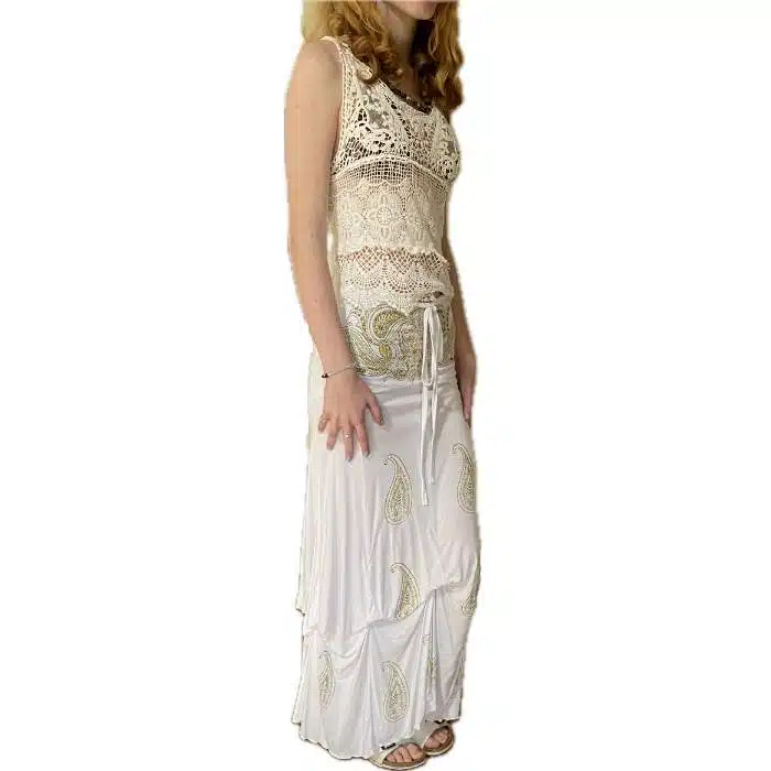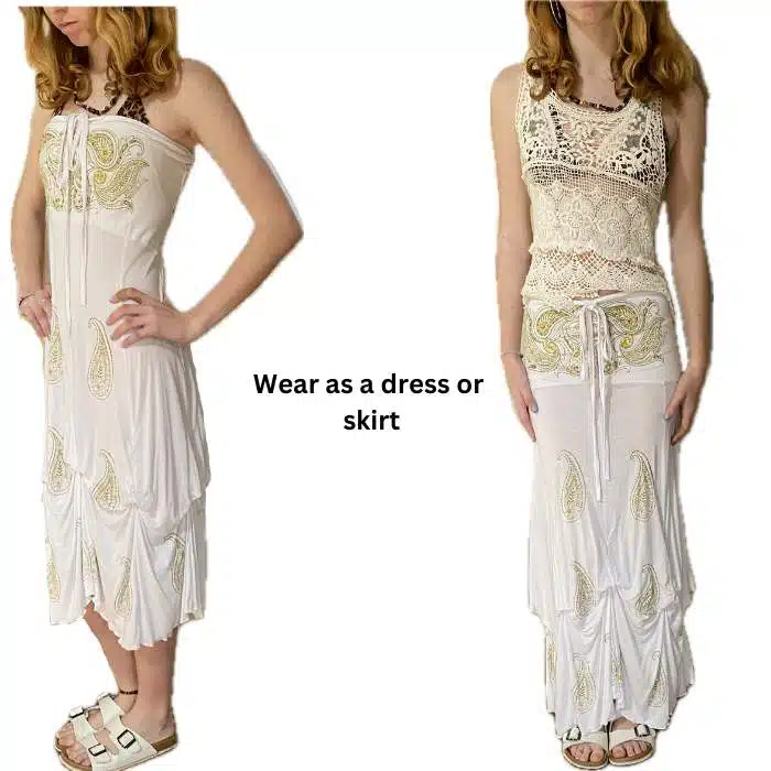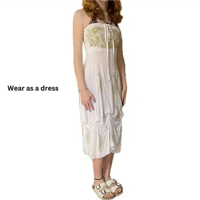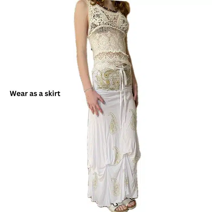 Boho Ethnic Long Skirt is ever so pretty and easy to wear. There are only one colour, with gold screen print. It can easily go with tee shirts or tops. Waistband has stretch elastic at the back, allowing it to fit many sizes. This skirt can also be worn as a dress. It even has a tie to go around the neck. Simply raise it up to chest height and have the plain band part sitting on top of the breasts. Fits sizes 6-12. Such a gorgeous long flowing skirt. We love the internal ties so you can make it ruched and add an unusual look .