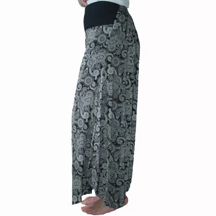 Thai Pant Skirt Combo is like a skirt and a pair of pants at the same time. They are made from a flowing soft rayon, which is perfect for any shape or style. The flatness of the front waistband make these pant skirt combo very slimming on the tummy line. There is plenty of elastic at the back half so these pants will fit most sizes 8-14 and allow plenty of room for a big meal lol!! The waist band is made from a soft cotton. This makes for comfortable wearing on the stomach and hips.