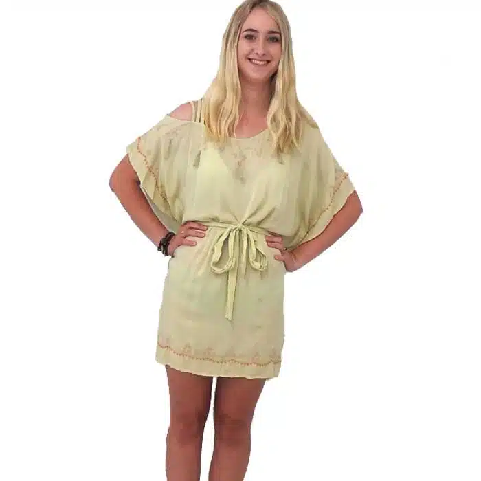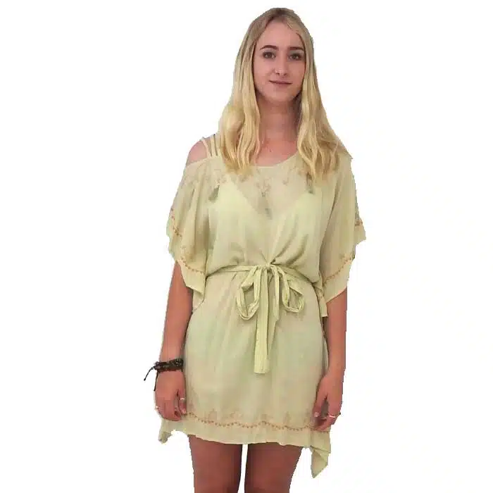 Beige Tassel Bohemian Top NZ has gorgeous embroider detailing at the front neck line, sides and at the hemline. This Tassel Bohemian Top NZ looks great worn as a top, or if you have the legs for it as a dress. It is a gorgeous addition to any wardrobe. There is even a heart embroidery pattern on the back. The ties at the waistline, help to draw in the waist and make this top more flattering. The beautiful boho embroidered patterns with light blue tassels, gives this garment a point of difference. The looseness creates a slimming effect. The garment’s loose cut shape ensures it will fit most sizes 8-14. It is not clinging and this makes it cooler for those hot summer days. This Tassel Bohemian Top NZ can be worn over bikinis to the beach or with nice shoes out on the town or to a music festival. Or it can be worn as a top with jeans or a skirt-this option is particularly great for a fuller figure