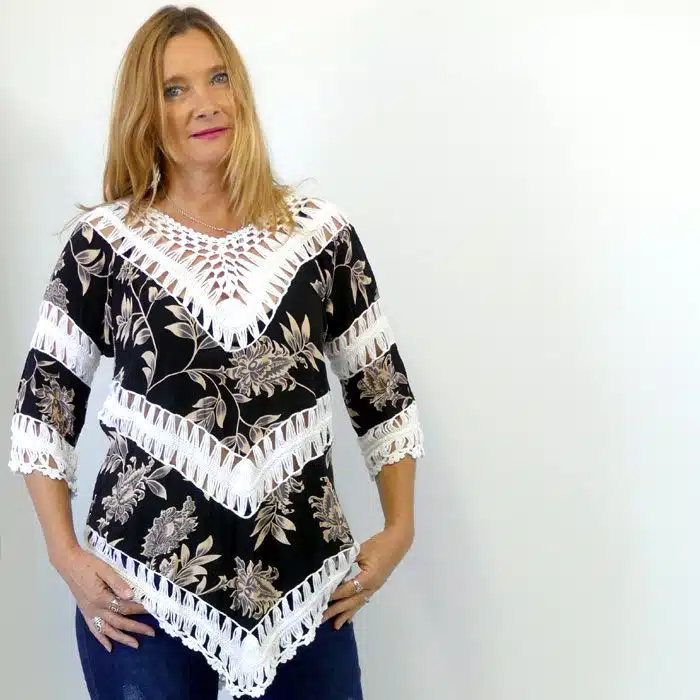 Bohemian Crochet Top Long Sleeve is simply stunning. One size fits most. By this we mean, it usually fits sizes 8-14. Love this hippy top so much! The crochet lace sections make this top really special. It can be worn with one shoulder dropped slightly down. At the bottom of the top, the crochet forms a V shape. This makes it a very flattering shape with looseness through the tummy area. The floral fabric has awesome prints making for a timeless, bohemian top. This gorgeous top can be worn with leggings or jeans in winter and with shorts or a skirt in summer. The lace in this top is simply divine and ticks a lot of boxes. It is perfect for trans seasonal weather, so that you will get a lot of wear out of it. These hippie tops are great for showing your individuality. Only one colour left sorry folks…be in quick to get the last ones.