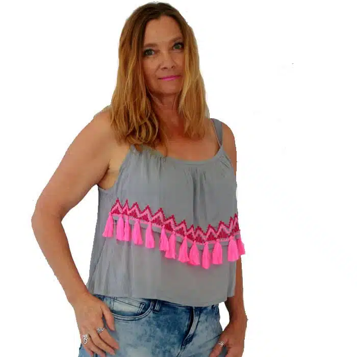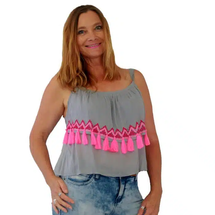 Crop Spaghetti Strap Top has gorgeous detail on the front with brilliantly coloured tassels and stunning embroidery. This Crop Spaghetti Strap Top can be worn as a top with shorts, leggings, pants or jeans. It looks great worn loose because it does not need to be tucked in and looks awesome with high waisted shorts. It is also good over bikinis or togs. It is designed to be worn loosely. This makes it lovely and cool for the hot summer months. We love the five colour options. This is a free size crop top so one size fits most 8-14. It looks great on a smaller size figure as well as a size 14. There is plenty of room for a fuller bust. Model is size 12, 163 cm height.