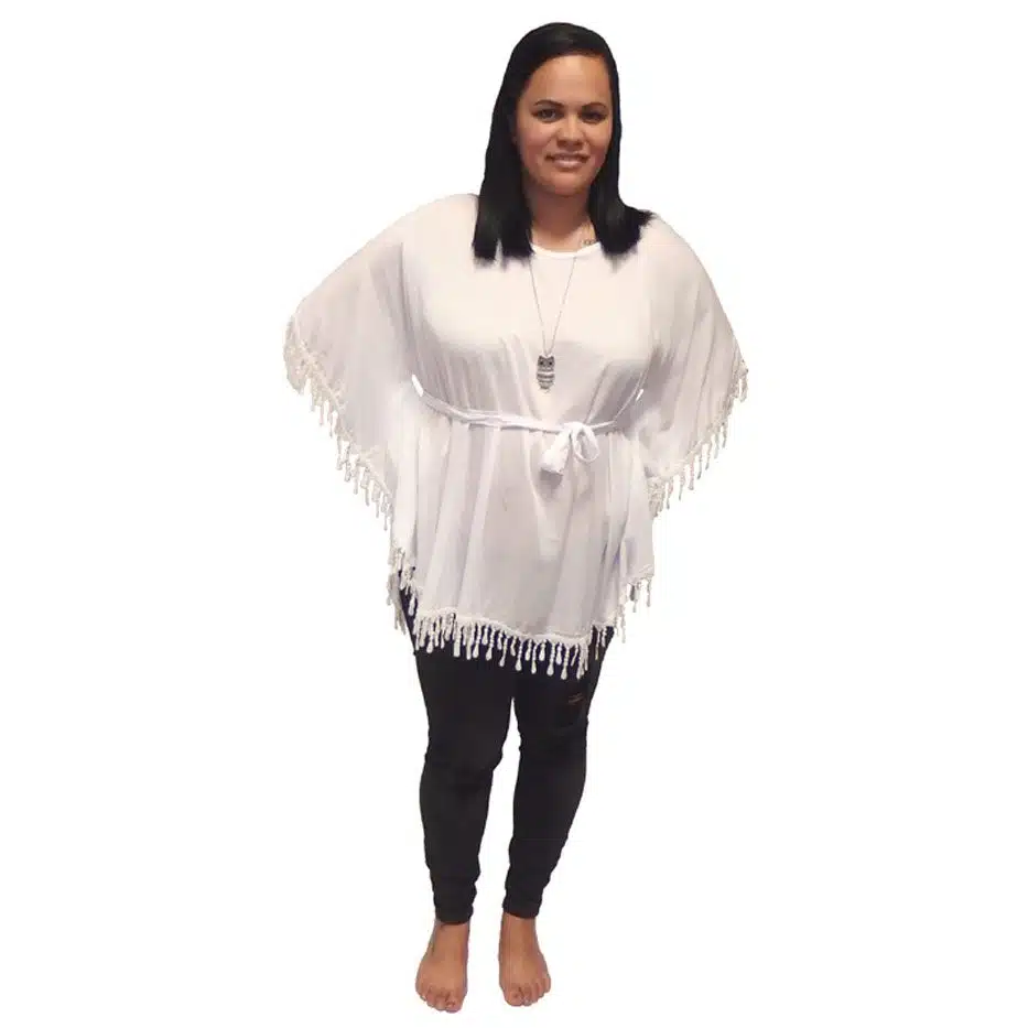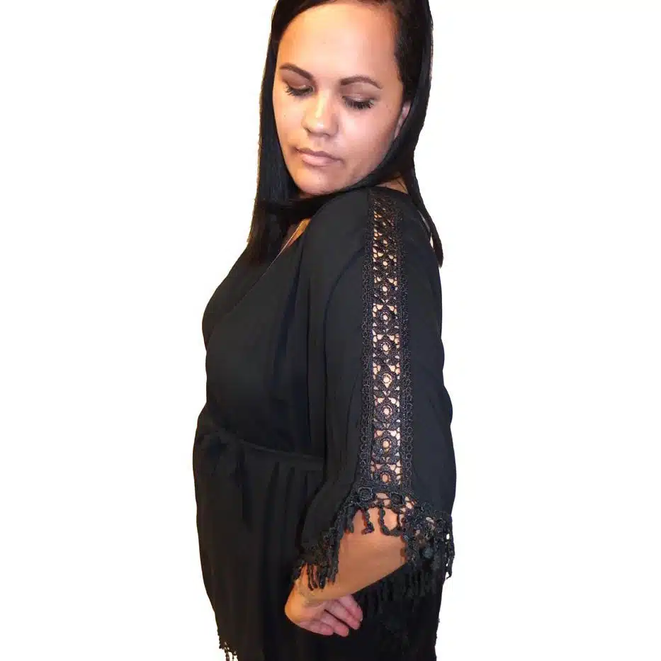 Lace Edge Tie Front Top is a free size kaftan top. It will fit sizes 8-16 easily. The lace detailing on the sleeve sides and the lace trim edging make it very cute. The tie front at the waistline creates a slimming effect. The tie ensures it will fit most bust and shoulder sizes. The tie gaps on the side are wide which means the tie can be wide and more flattering. There is no side seams, just the ties. So if you are less that 126 cm in your waist/bust {49 inches} it should fit. If you lay this top our flat is is actually a half circle.
