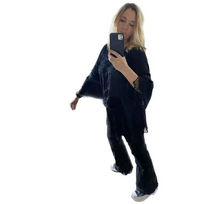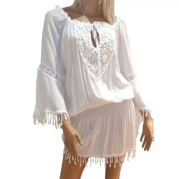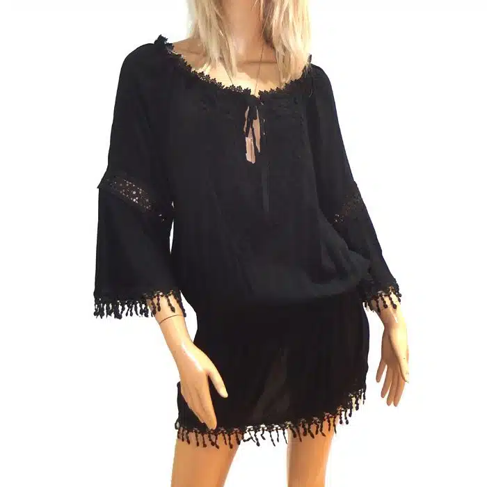 Lace Tassel Tie Top is a gorgeous addition to any wardrobe. The flared lace sleeve and beautiful Boho style create a slimming effect. The wide, tie-up fit ensures it will fit most sizes. This Bohemian lace top also features gorgeous tassel lace along the bottom hemline. It has a wide adjustable tie-up neck. This top can be worn as a dress if you have the legs for it as it is a a short cutie. Or you can wear it with shorts in the warmer weather. For winter choose tights or jeans. Just pop on a merino underneath or a jacket on top to keep your arms warm. This tunic top comes in 3 colours, white or black or grey with black lace. Just pick your favourite, or grab both!