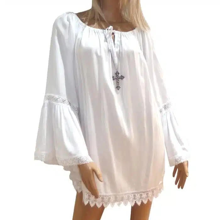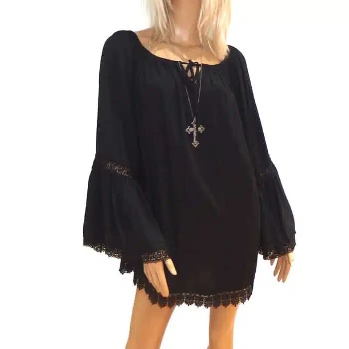Lace Trim Tunic Top is a gorgeous addition to any wardrobe. The flared lace sleeve and beautiful Boho style create a slimming effect. The wide, open fit ensures it will fit most sizes. By this we mean sizes 8-14. This tunic top also features gorgeous lace along the bottom hemline and an adjustable tie-up neck. This top can be worn as a dress or with shorts in the warmer weather, and with tights or jeans in the winter. Just throw on a merino or jacket to keep your arms warm. This tunic top comes in 2 colours, black or white. Just pick your favourite, or grab both! Loose summer top is perfect as a beach cover up. Dress it up with heels or down with jandals or sandals. Lace Trim Tunic Top looks great in the camp ground, resort or out on the town.