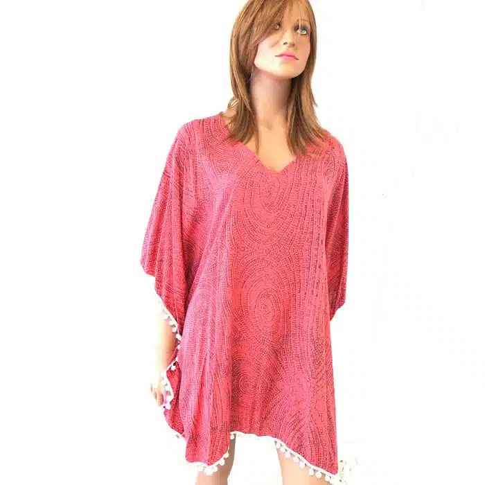 Pom Pom Poncho top is a gorgeous beach cover up poncho. We love the extra embellishing of pom poms on the hem and edge of the arms. It is lovely to throw over a dress, jeans, bathers, or to keep the sun off at a music festival. It is made from light-weight, cool and soft rayon. The perfect throw over for in between and hot summer weather.