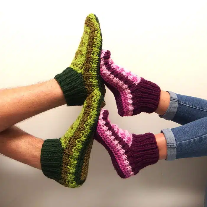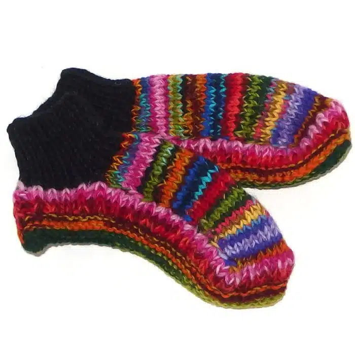 Nana knitted slippers are hand knitted in Nepal with New Zealand wool. Just like Nana would make! Comfy knitted slippers to keep your feet warm and toasty all year round. These wool slippers come in a range of different colours and patterns. Just choose your favourite! These knitted slippers are also available lined, if this is preferred. There is a choice of medium and large now. Guys can fit the large. These unlined slippers are a bit more stretchy than the lined. So they are a better choice if you are worried about the size. Our customers love these Nana knitted slippers. We sell lots of them.