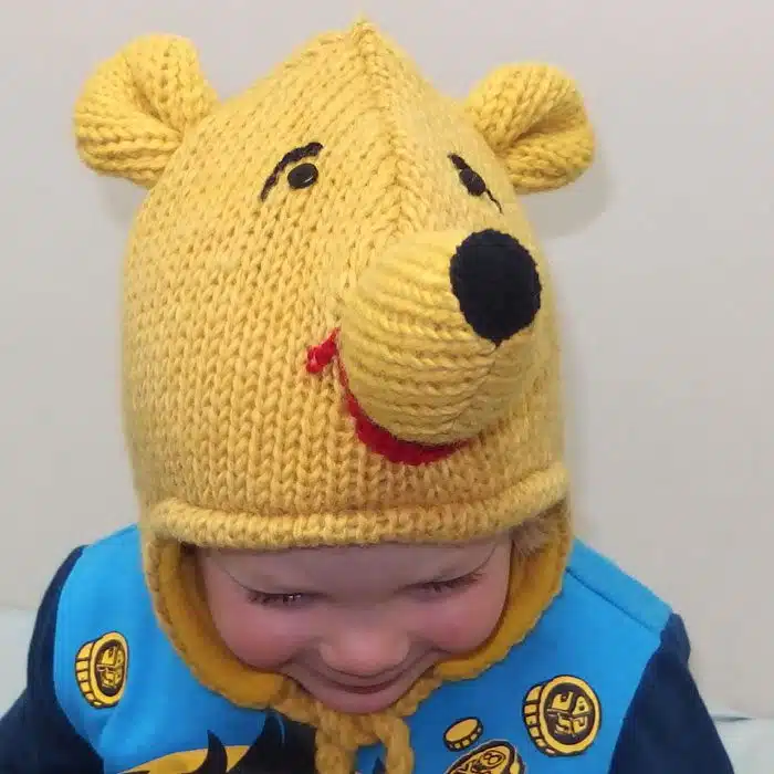Pooh bear Animal hat in our very own New Zealand wool. It is fleece lined so it wont be prickly and will keep you toasty warm! Ear flap style so it can be tied under your chin in a wind and tied on, to stay on for a young child. Great for the outdoors or just a bit of fun. In child’s or adult’s size to fit everyone! This pooh bear animal hat is loved by our customers.