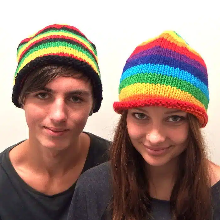 This wool beanie comes in a variety of colours to suit both sexes. Sorry the Rainbow and Rasta are sold out. The black one is very popular with the guys. Ha ha and the pinks are popular with the girls.